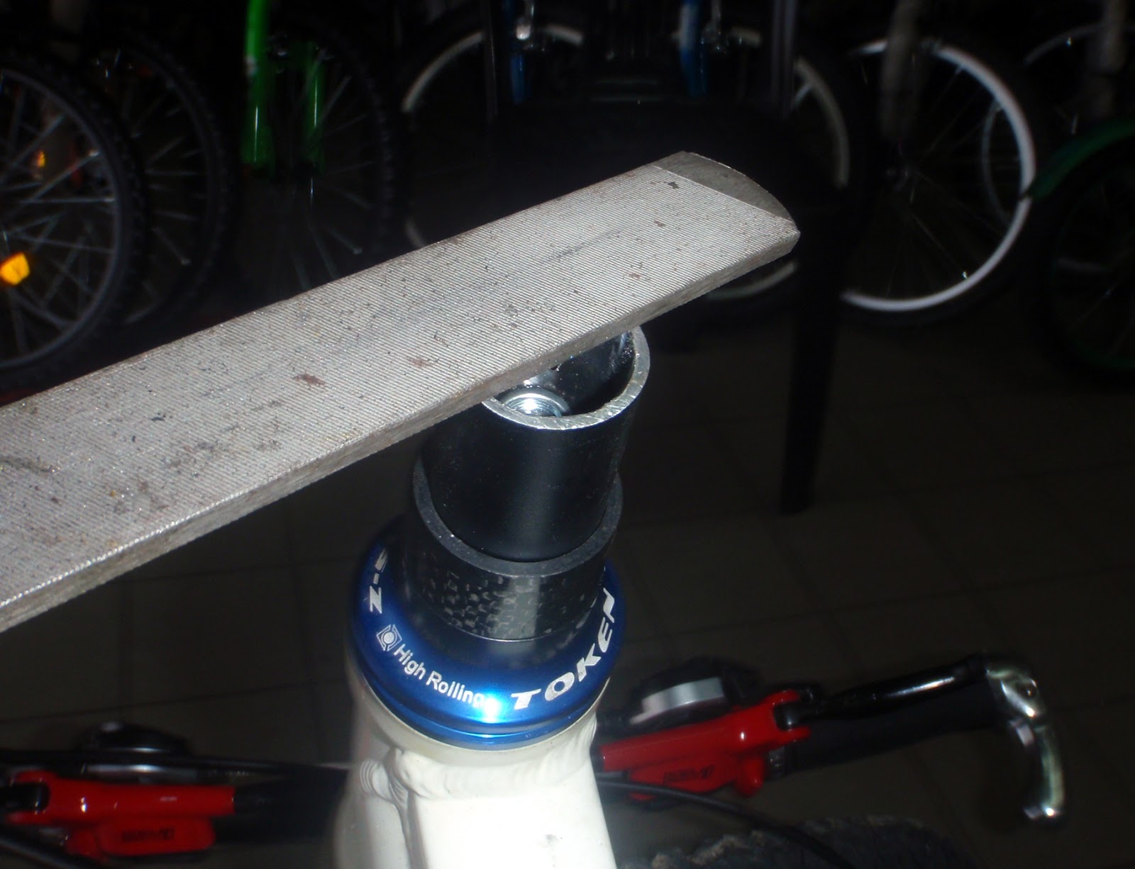 Longgarkan bol yang megikat stem. Bila sudah cukup longgar, cabut stem bersama dengan bar hendal dan kaum kerabatnya daripada steerer.